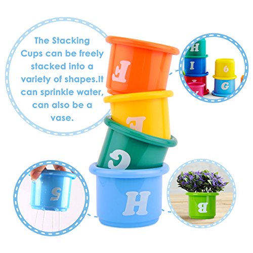 [COLORFUL &CUTE DESIGN] With 5 different lovely shape -Yellow duckling, Blue whale, Yellow agouti, Red goldfish and colorful stacking cups, encouraging the baby's brain development. Bright colors, stimulating the baby's eyes, helping kids recognize color, observe shape, and promote babies operational ability. All in all, the toys and games can teach basic counting concepts and develop hand-eye coordination for your little child.