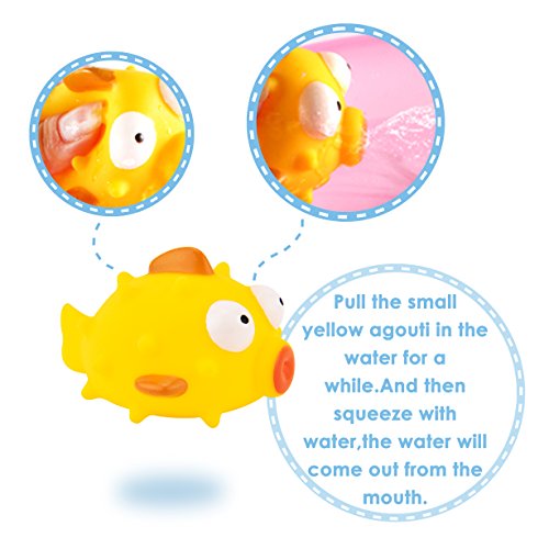 The duck/agouti/whale/goldfish-Very cute toy animals,they can float on the water,there are different games your child can play, for example,sprinkler like a shower,swim like a boat.Just let your child discover new creative games with their new animal friends.