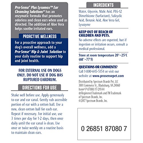 Pro·Sense brand offers a variety of proactive, sensible solutions for all of your pet’s healthcare and wellness needs. We know pet parenting can be tough, which is why we’ve improved our ingredients and benefits to make it easier than ever to care for them like any other member of your family. Pro-Sense Plus Lysomox Ear Cleansing Solutions has an enzymatic formula that promotes odorless and clean ears when used as directed. Use this solution to help relieve some discomfort by reducing debris and wax buildup. The addition of Aloe Vera helps to soothe irritated ears as well. You can use this ear cleanser once or twice weekly on a routine basis to maintain clean ears by applying a generous amount to the ear and ear canal. The Lysomox enzyme works to dissolve and remove debris from your dog's ears, after you gently run the accessible portion with a cotton ball.Feature