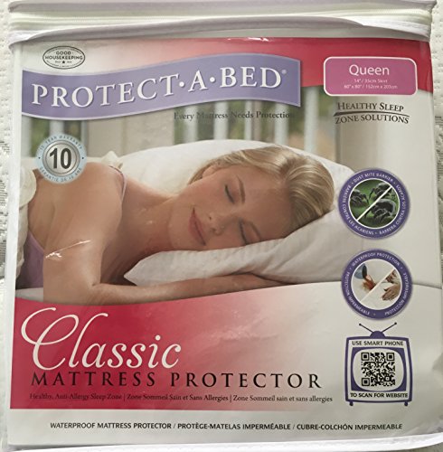 -. Brand : Protect-A-Bed -. Color : White -. Feature : 100% Polyester Good Housekeeping Seal of Approval. Compare to Protect-A-Bed Basic Mattress Protector / Waterproof: Polyurethane film backing repels liquids like urine and sweat. 10-year manufacturer's warranty / Breathable Barrier Fabric: NOT hot to sleep on. Allows body vapor to breathe through pad. / Dust Mite and Allergy Barrier: Miracle membrane backing provides a healthy sleep zone for your family. / Easy to Wash and Use: Machine washable in warm or hot water. Tumble dry on medium heat. -. Label : Protect-A-Bed -. LegalDisclaimer : Did you know that every mattress needs a Protect-A-Bed Mattress Protector? FACT: Every night the human body loses a liter of body fluids through the skin pores and mouth, as well as millions of skin flakes. Unprotected mattresses thereby create the perfect breeding ground for bacteria and dust mites (a major cause of asthma, eczema and rhinitis). You can control this by fitting a Protect-A-Bed Basic Mattress Protector, which is also especially helpful in cases of incontinence. Features smooth polyester top layer that is comfortable under your sheets. Protects against leaks or tears for 10 years or the factory will replace the pad at no cost. Wash before use for best results. Do not bleach or dry clean. -. Manufacturer : Protect-A-Bed -. MPN : CLA0135 AQUEE -. PartNumber : CLA0135 AQUEE -. ProductGroup : Home -. ProductTypeName : HOME_BED_AND_BATH -. Publisher : Protect-A-Bed -. Studio : Protect-A-Bed -. Title : Protect-A-Bed Classic Smooth Mattress Protector