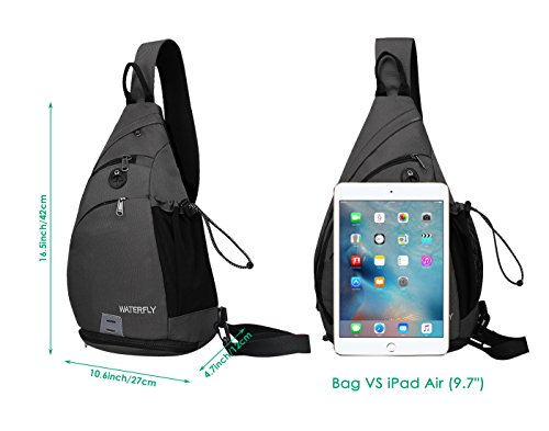 -. Brand : Waterfly -. Feature : LIGHTWEIGHT & STYLISH DESIGN - The dimension of this sling bag is 42 x 27 x 12 cm (H x L x W) and weights 0.425 kg , lightweight and portable / LARGE CAPACITY & MULTIPLE COMPARTMENT: 7 pockets in total- one main pocket to fit iPad 4/5/6; one zippered gause pocket to store your umbrella on the base of the outside backpack; one bottle pocket sided the sling bag and two small pockets on the strap and back, as well as several inner separated small pockets, you can take necessities all in one bag / BREATHABLE & SOFT PADDED BACKSIDE: The back side comes with protective padded design, breathable and comfortable, easy to carry throughout all day / WATER REPELLENT & ANTI-FRICTION: This sling bag is made of special linen material, which is water repellent, easy to clean and anti-friction, effectively prevent it from tearing, wetting and ripping / PERFECT CHOICE FOR OUTDOOR: It is much more secure and relaxed for most outdoor activities or recreation like hiking, vacations, bike rides, gym, running, walking in the park with the dogs, festivals, raves, music festival, amusement park, theme parks, etc -. Label : WATERFLY -. Manufacturer : WATERFLY -. ProductGroup : Sports -. ProductTypeName : OUTDOOR_RECREATION_PRODUCT -. Publisher : WATERFLY -. Size : small -. Studio : WATERFLY -. Title : Sling Backpack, WATERFLY Sling Bag Small Crossbody Daypack Casual Canvas Backpack Chest Bag Rucksack for Men & Women Outdoor Cycling Hiking Travel