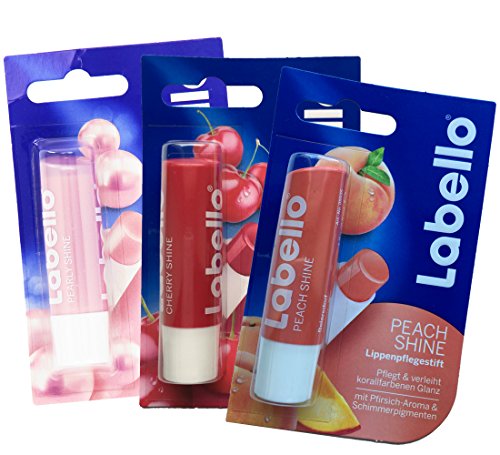 Labello Pearly Shine, Cherry Shine and Peach Shine lip balms bundle. A great selection of lip balms from Labello for every day. Enjoy the different flavours regarding your mood and take care of your dry or chapped lips. The Labello Shine line provides a subtle color and long-lasting moisture.Feature