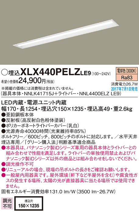 ●寸法(mm):幅170・長1254・埋込穴150×1235・埋込高49