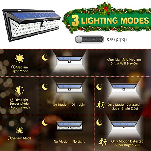 Dim light sensor light mode: litom 54led solar light will charge in the day, auto turn on dim light when in the darkness or at night when no motion is detected. It will turn to bright light when motion is detected and last about 17-20 seconds.