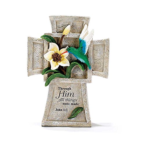 In the Beginning God Created Genesis 1:1 Blue Butterfly Flowers Resin Stone Tabletop Cross