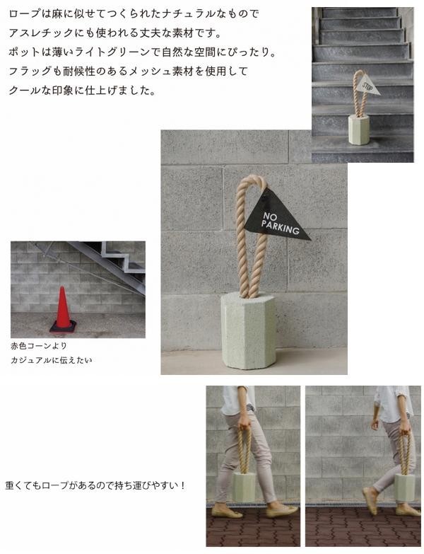 | 丈夫なロープとコンクリートのコンビネーションの、オシャレな案内スタンド。赤色コーンよりもカジュアルに、生活空間などの雰囲気を壊さずに設置して頂けます。本体はコンクリートの為、風に飛ばされず安定感があります。使用後のセメント部分はロープを外して植木鉢としてもお使いいただけます♪ |