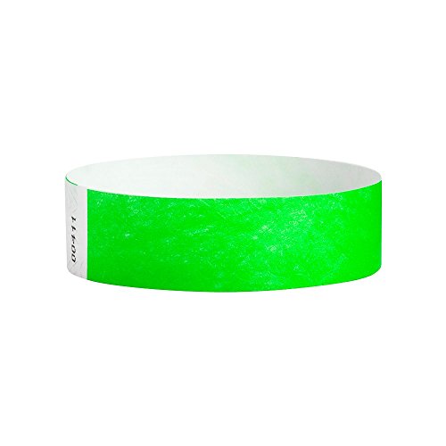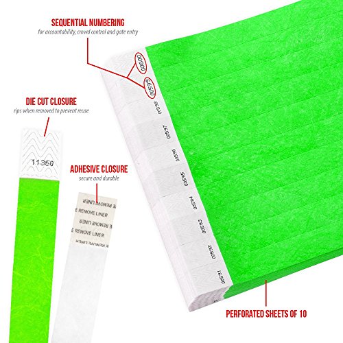 500 NEON GREEN 3/4 INCH PREMIUM BLACK LIGHT SECURITY TYVEK WRISTBANDS FROM WRISTCO - The 500 wristbands are packaged in sheets of 10 for 50 sheets total. Each wristband measures 3/4 inches wide by 10. Each wristband is numbered for security and identification accountability.