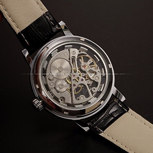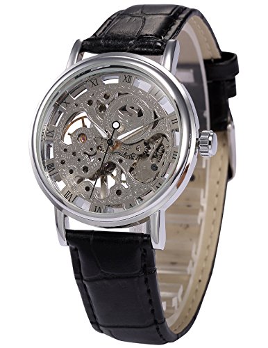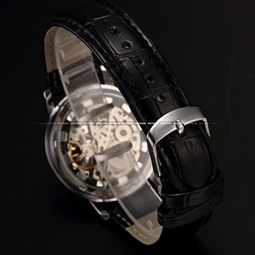 -. Title : AMPM24 Mens Mechanical Skeleton Watch Hand Wind Up Silver Dial Black Leather Strap PMW357