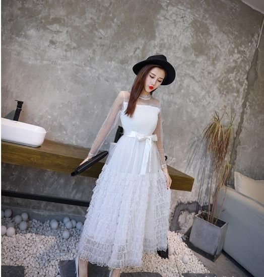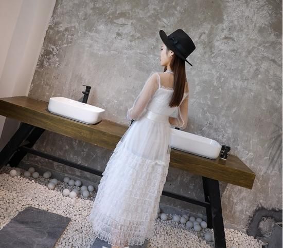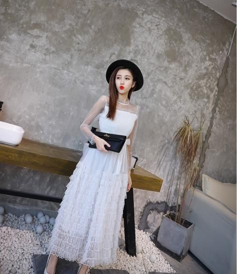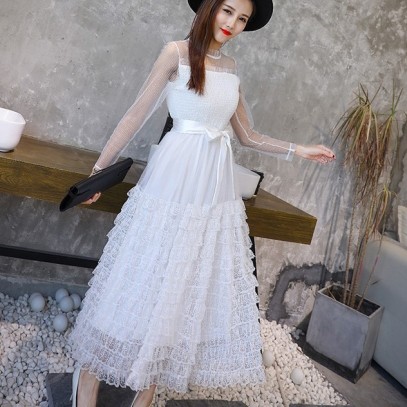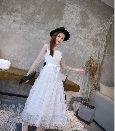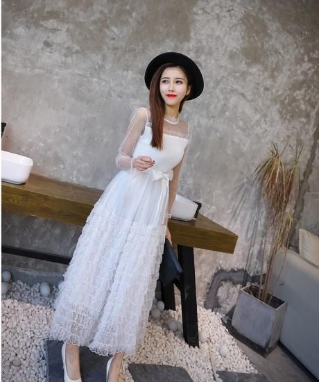 ドレス ワンピース ロング丈 レース フリル シースルー リボン 華やか エレガント パーティー お呼ばれコーデ 二次会 drgz1556