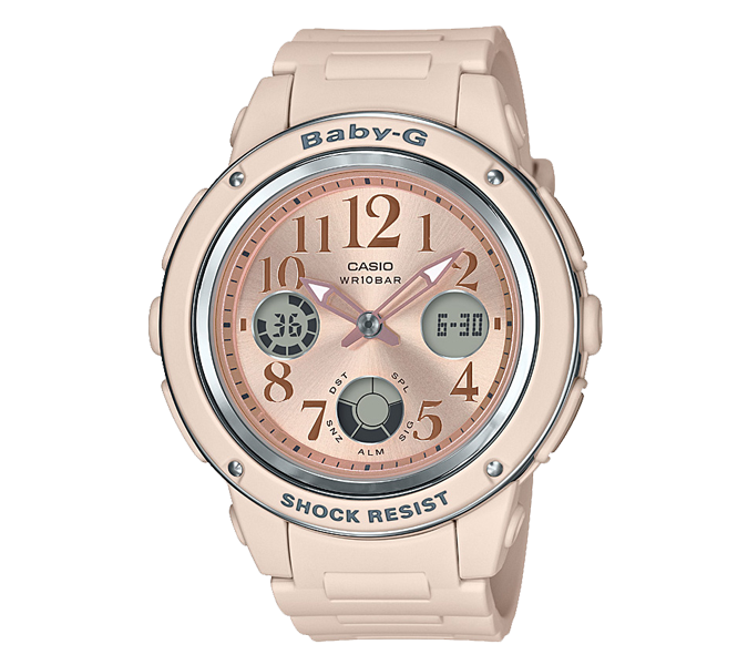 이 시리즈의 베이스 모델로 심플한 페이스 모델의 BGA-150를 사용했습니다. 밝은 베이지 컬러의 메탈릭한 파츠들이 주는 악센트는 시크하고 어른스러운 디자인을 완성시킵니다.