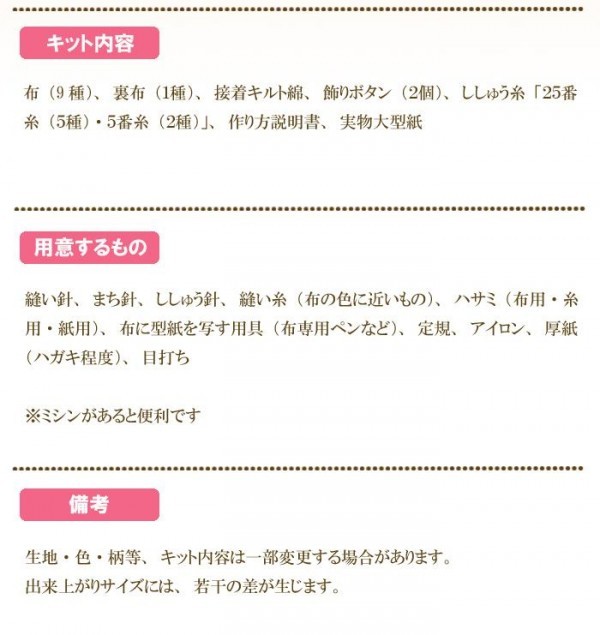| セット内容 | 布(9種)、裏布(1種)、接着キルト綿、飾りボタン(2個)、ししゅう糸「25番糸(5種)・5番糸(2種)」、作り方説明書、実物大型紙 |