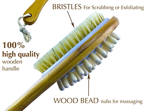 HIGH QUALITY HYGIENIC AND NATURAL. Brush is made of natural bristles. Massaging nubs are made a combination of 38 wood beads. The handle and head made of finest quality wood.
