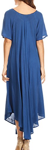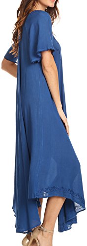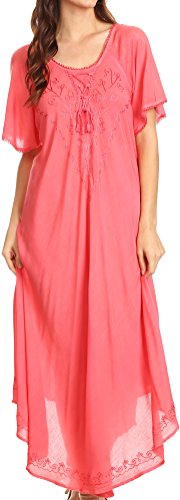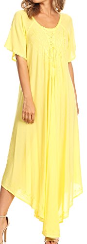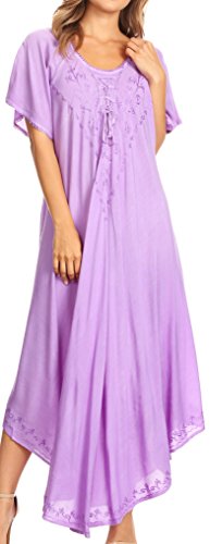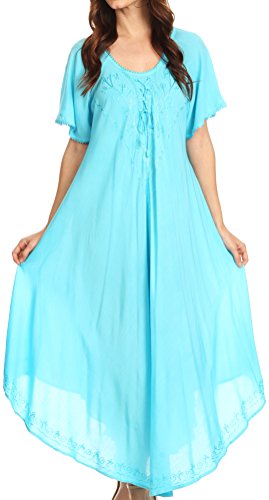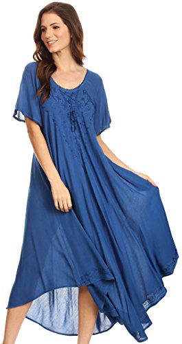 This dress features beautiful floral embroidery along neckline and circle style hem. Fabric is semi-opaque and soft to touch. Dress has ties at waist and lace-up drawstring bodice that make dress versatile for all body types. Crochet-lace trim embellishes neckline as well as its comfortable sleeves. Wear dress with your sandals or heels. Perfect for beach or poolside parties, vacations, festivals, or as lounge wear. 100% Rayon | Hand wash separately in cold water. | Imported