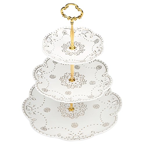 -. Title : 3 Tier Vintage White Ceramic Dessert Cupcake Stand with Gold-Tone Plated Floral Design and Handle