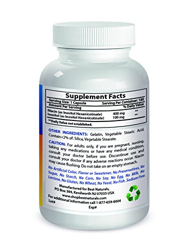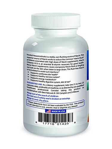 -. Binding : Health and Beauty -. Brand : Best Naturals -. EAN : 0817716014258 -. Feature : Cardiovascular support / promotes energy metabolism / Supports healthy nervous system / Supports healthy digestive system / All Best Naturals products are manufactured in accordance with Good Manufacturing Practices (GMP), among the highest standards in the world -- Proudly Made in USA -- Purity & Potency Guaranteed -. Label : Best Naturals -. Manufacturer : Best Naturals -. ProductGroup : Health and Beauty -. ProductTypeName : HEALTH_PERSONAL_CARE -. Publisher : Best Naturals -. Studio : Best Naturals -. Title : Niacin 500 mg 180 Capsules by Best Naturals - Flush Free Niacin (Vitamin B-3) - Manufactured in a USA Based GMP Certified and FDA Inspected Facility and Third Party Tested for Purity. Guaranteed!! -. UPC : 817716014258