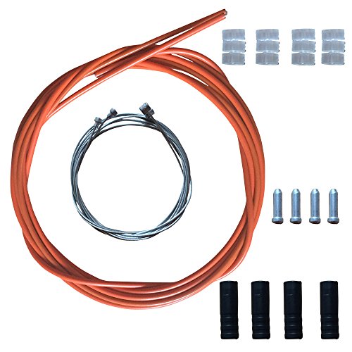 Specifications: 1pc Brake cable housing : 5mm ,w/ plastic inner sleeve for smoother braking, , Aprox. 2.4 meters (94.5 inches) 2pc Brake cable : 1.5mm Galvandized (1x19strains) Pre stretched double headed with 7x6mm mountain bike , 6x11mm road bike, Front length-1100mm, Rear length-1700mm 1pc shifter cable housing : 4mm w/ plastic inner sleeve for smoother shifting, , Aprox. 1.9 meters (74.5 inches) 2pc shifter cable : 1.2mm Galvandized (1x19strains) Pre stretched 4.3x4.4mm shimano/sram Front legnth- 2000mm, Rear length-2000mm accessories :all the necessary end caps , crimps and ferrules ----------IMPORTANT NOTE: (1) the housings are cut with water saw, there might be some surface rust at the beginning of the housing, simply cut the first half an inch to see the fresh metal (2) the brake and shifter housing is made with different material and technology , there will be a slight color shade difference between theFeature