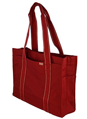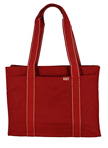 Ensign Peak's durable poly zipper tote bag features two main outside pockets and two side outside pockets. The full zipper top keeps things out of sight and secure. The inside of the bag features a spacious main compartment with a handy zippered pouch large enough for a cell phone, keys or loose change. Generous Straps are long enough to allow the bag to be carried on the shoulders. Bag dimensions 15 1/4" W x 11 1/4" H x 5" D. Made of 600 denier polyester with a heavy vinyl backing.