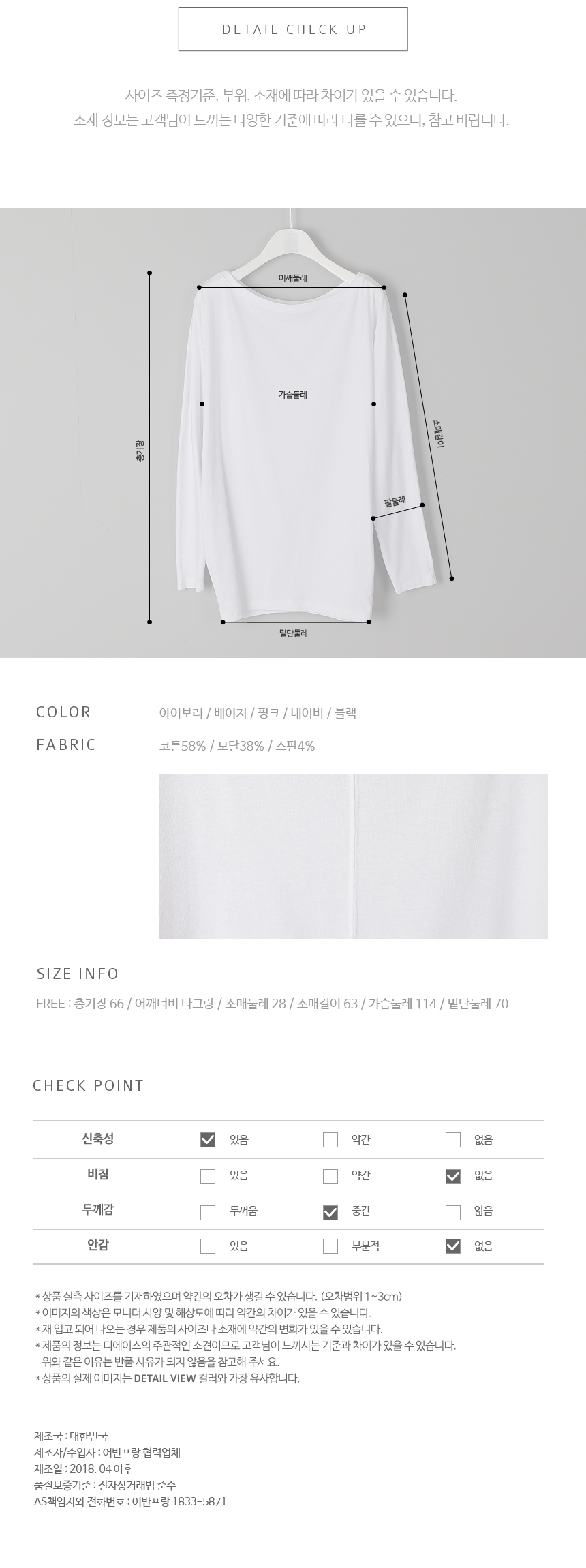 보드라운 착용감에 자꾸만입고싶은 가오리핏 티셔츠에요입었을때 허리라인이 자연스럽게핏되면서 허리라인이 슬림해보여요보트네크라인으로 세련된 느낌이구요가오리핏으로 군살커버가잘되요다양한 아우터,하의와 손쉽게 코디되어데일리아이템으로 추천드려요색상은 아이보리,베이지,핑크,네이비,블랙사이즈는 FREE 44~66▼ 관련상품 : 빗살 플리츠 와이드팬츠카브라 면 배기밴딩팬츠 허니 항공점퍼