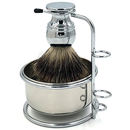 100% Pure Genuine Badger Brush - Outstanding Quality Elegant Silvery Brush Handle + Beautiful Stainless Steel Shaving Soap Bowl and Razor Brush Stand, The...