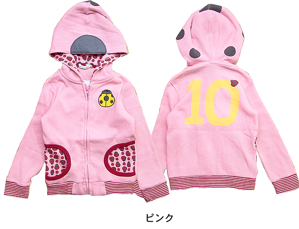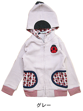 胸のアップリケの他にも、フードとポケットの裏地は小さなてんとう虫が