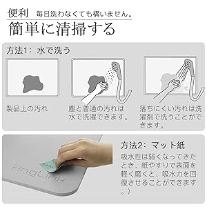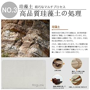AngLink 珪藻土速乾バスマットは太古の植物性プランクトン(珪藻)が原材料です。「驚異の吸水力」「脱臭湿度調整効果」「カビやダニの発生を抑制」「洗濯不要でいつでも快適」と多機能が特徴のバスマットです。