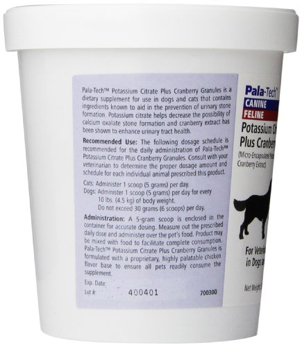 Product Description Pala Tech Potassium Citrate Plus Cranberry Granules are formulated for felines and canines. Industry-first formulation to effectively manage urinary tract health in cats and dogs. Formulation includes potassium citrate to prevent the formation of calcium oxalate stones in the bladder. Contains cranberry extract which has been shown to enhance urinary tract health 0