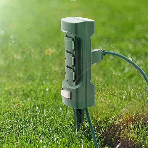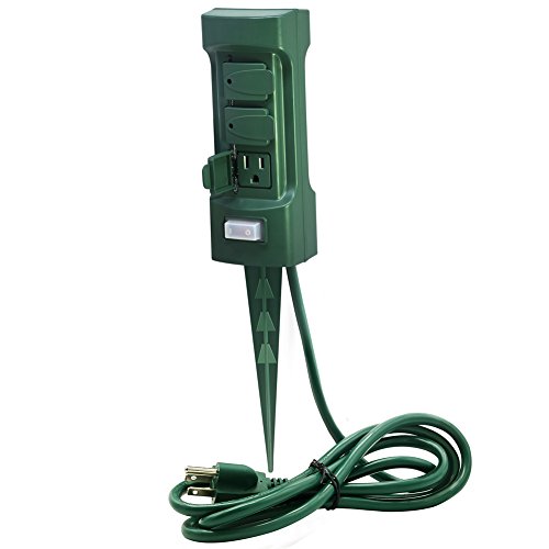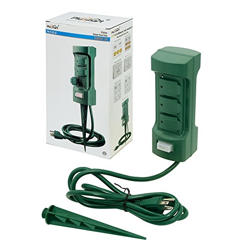 Plusmart 6 Outlet Outdoor Power Stake with Cover and On Off Switch, 6 ft Weatherproof Extension Cord, Green, ETL Certified