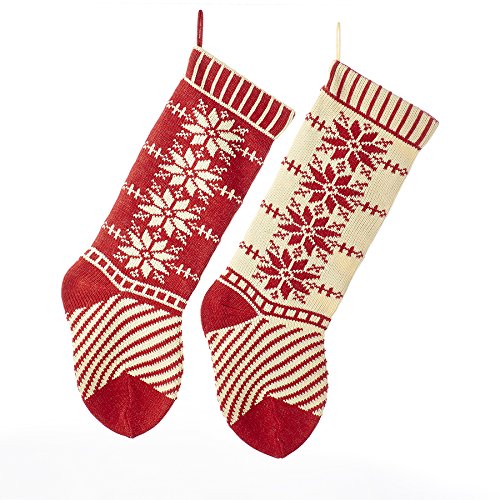 - These Red and Ivory Heavy Knit Snowflake and Stripe Stockings from Kurt Adler are a lovely addition to any holiday decor. These 20-inch stockings have a delightful vintage design with snowflake and stripes in red and ivory. This assortment includes a red stocking with ivory snowflakes and stripes and an ivory stocking with red snowflakes and stripes. Each stocking has a small loop at the top for easy decorating.