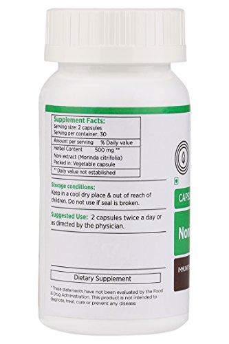 -. Binding : Health and Beauty -. Brand : Kapiva -. EAN : 8906082520554 -. Feature : DOSAGE: 500 mg; PACKAGE CONTENT: 60 Vegetable Capsules. / ABOUT THE BRAND & PRODUCT: Kapiva's GMP is Certified Noni Capsules whose quality is approved by Baidyanath supports the immune system and detoxifies the body. / KNOWN AS: Noni is also known as "The Tree for Headaches" or "The Painkiller Tree" as it reduces the pain comparable to the drugs tramadol and hydrocortisone, making it effective against arthritic and other joint pains. / SIGNIFICANCE: The Noni tree produces bumpy pitted fruit; whose skin becomes semi translucent when the fruit ripens. The fruit has an offensive odour and is quite unpalatable. The Polynesians have used the Noni fruit and leaves as folk remedies for over 2000 years. / MEDICINAL PROPERTIES: It prevents the absorption of LDL cholesterol & makes the brain healthier and activates macrophages and strengthens the immune system. -. IsAdultProduct : 0 -. Label : Adret Retail Pvt. Ltd. -. Manufacturer : Adret Retail Pvt. Ltd. -. MPN : KAP0019 -. PackageQuantity : 1 -. PartNumber : KAP0019 -. ProductGroup : Health and Beauty -. ProductTypeName : HEALTH_PERSONAL_CARE -. Publisher : Adret Retail Pvt. Ltd. -. Studio : Adret Retail Pvt. Ltd. -. Title : Noni 60 Veggie Capsules 500 mg Supplement Amazing Antioxidant Punch For Regulating Blood Pressure Boosts Immunity & Provides Cellular Repair