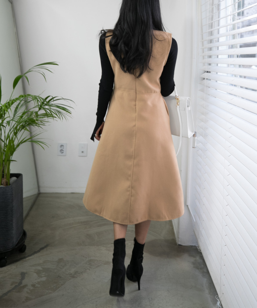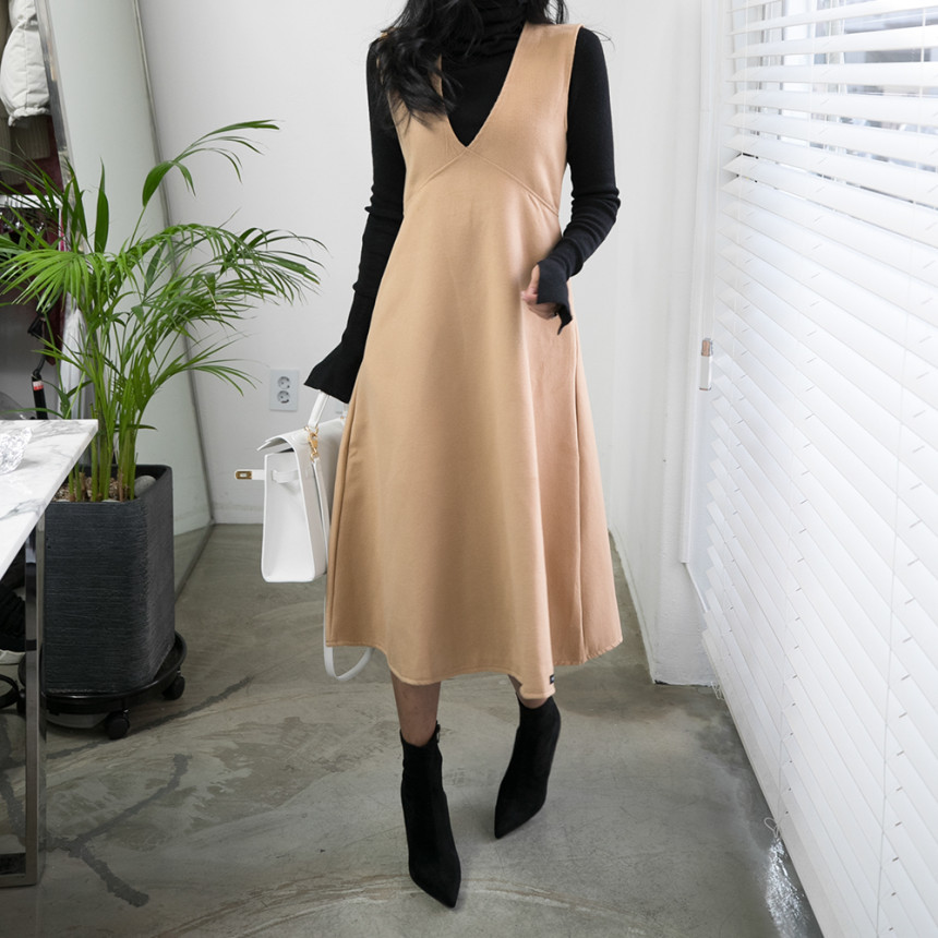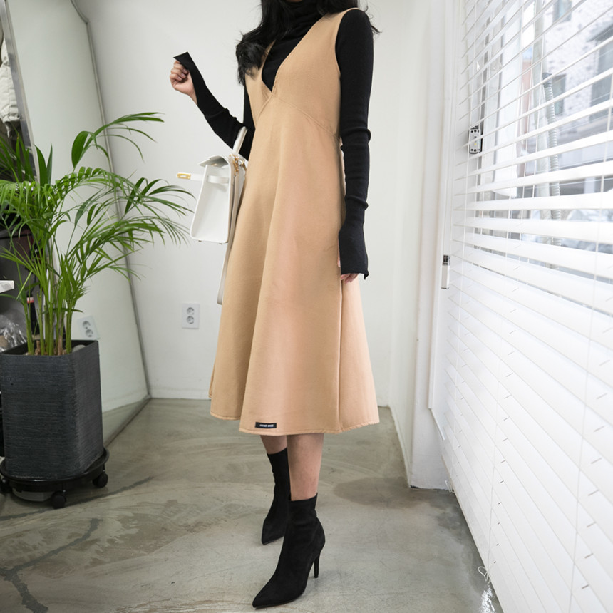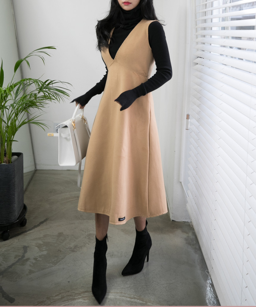 여성스러움과 체형커버를 동시에 톡톡히 느끼게해주는 원피스에요. 깊은 브이네크라인과 다트 디테일이 있어 바스트 밑부분을 살짝 잡아주어 날씬하게 표현해드리며, 롱한 플레어라인으로 촤르륵 떨어지는 치마라인이 정말 예술이에요. 도톰한 소재감에 핸드메이드로 제작되어 간단한 이너웨어와 스타일링해주면 여성스런 실루엣이 연출된답니다. <;기획특가 >; ♥ 천사가격 + 무료배송 ♥