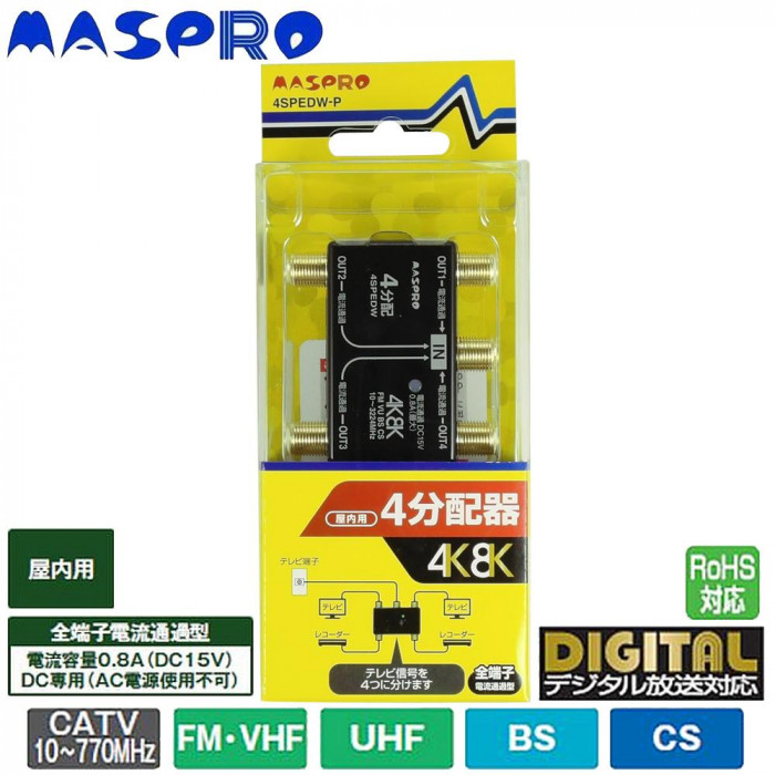 屋内用の4分配器です。4K・8K衛星放送(3224MHz)対応!