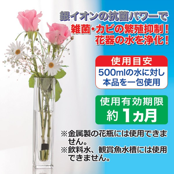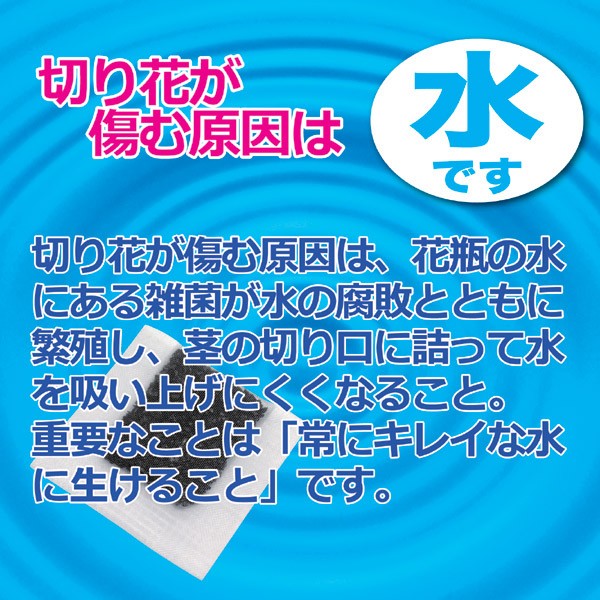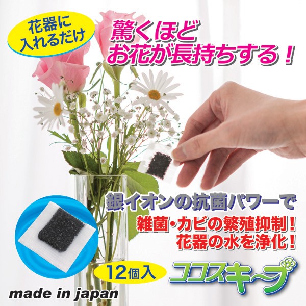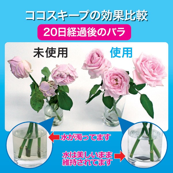 お花を入れた花瓶の水は、2、3日もすると濁ってきます。植物を水にさすと、切り口からどんどん有機物が水に溶け出し、それを餌としてバクテリア(微生物)が増殖します。この微生物が増殖することで水は濁ってきます。この腐敗した水が原因で、花が早く枯れたりもします。ココスキープは、銀イオンの抗菌作用で水中の微生物やカビの繁殖を防ぎ水を常にキレイな状態に保ち、花を長持ちさせます。500mlを上限に1個使用します。