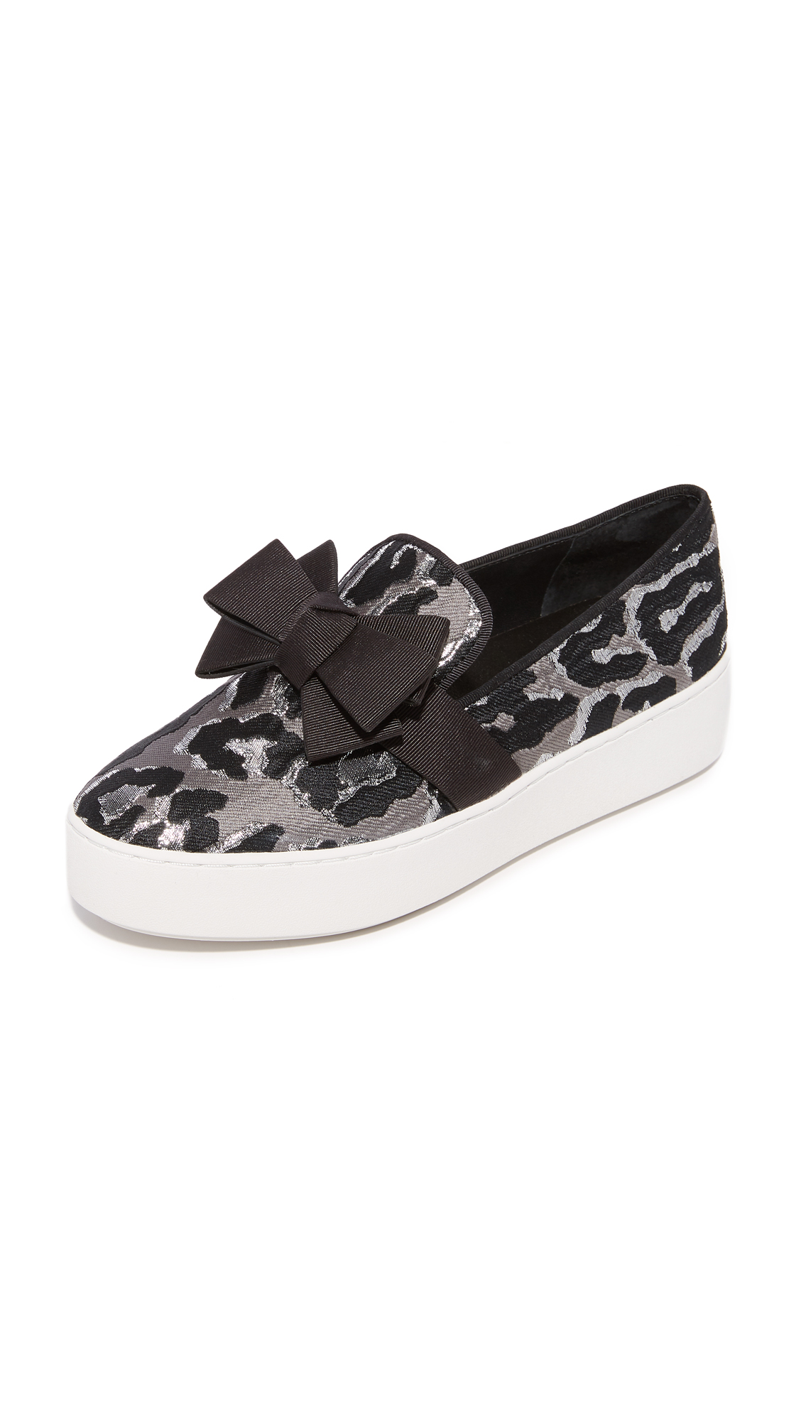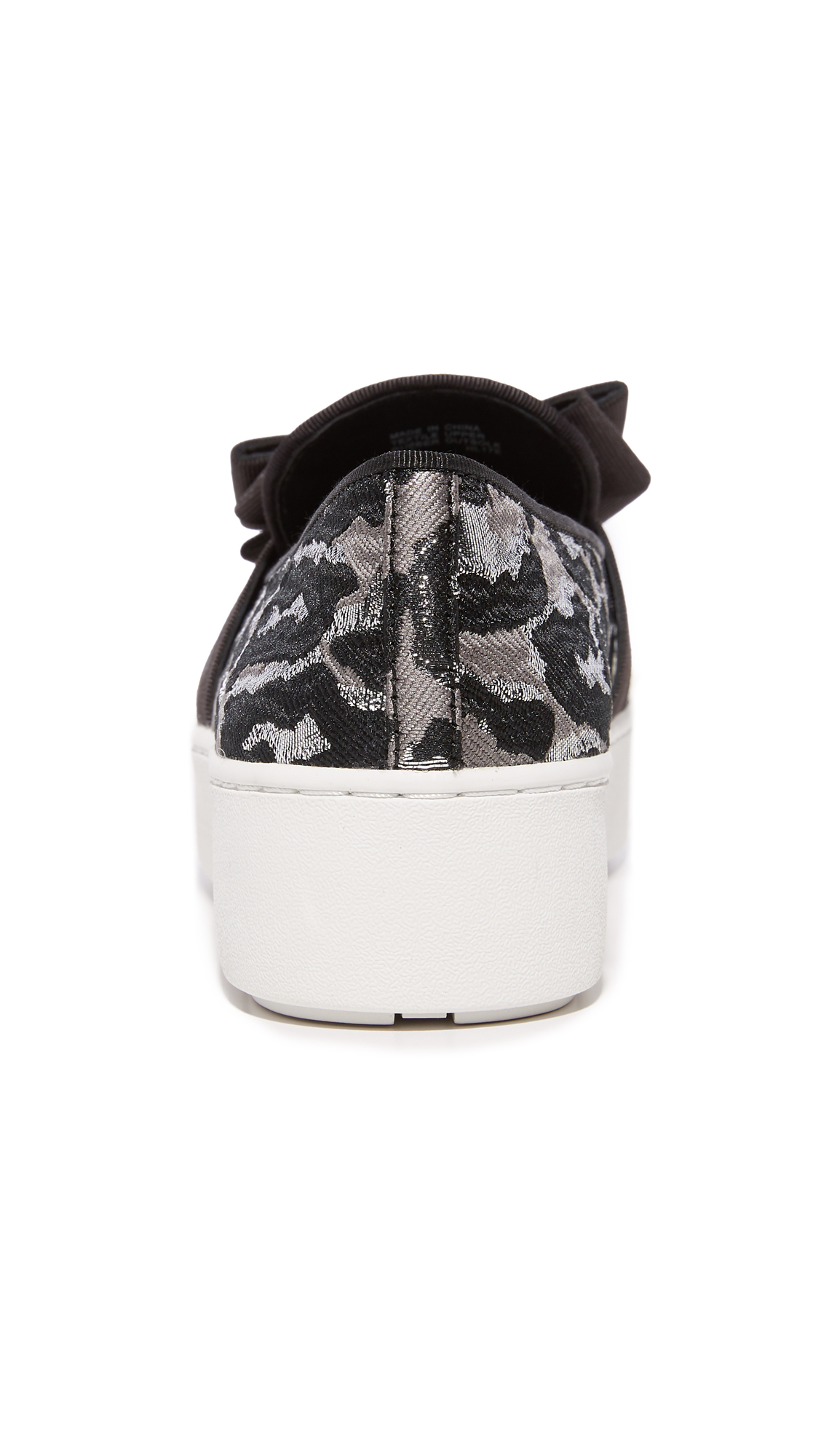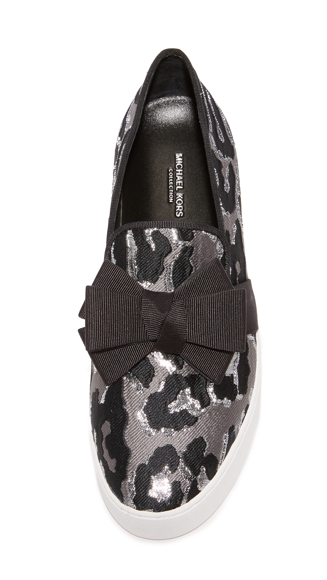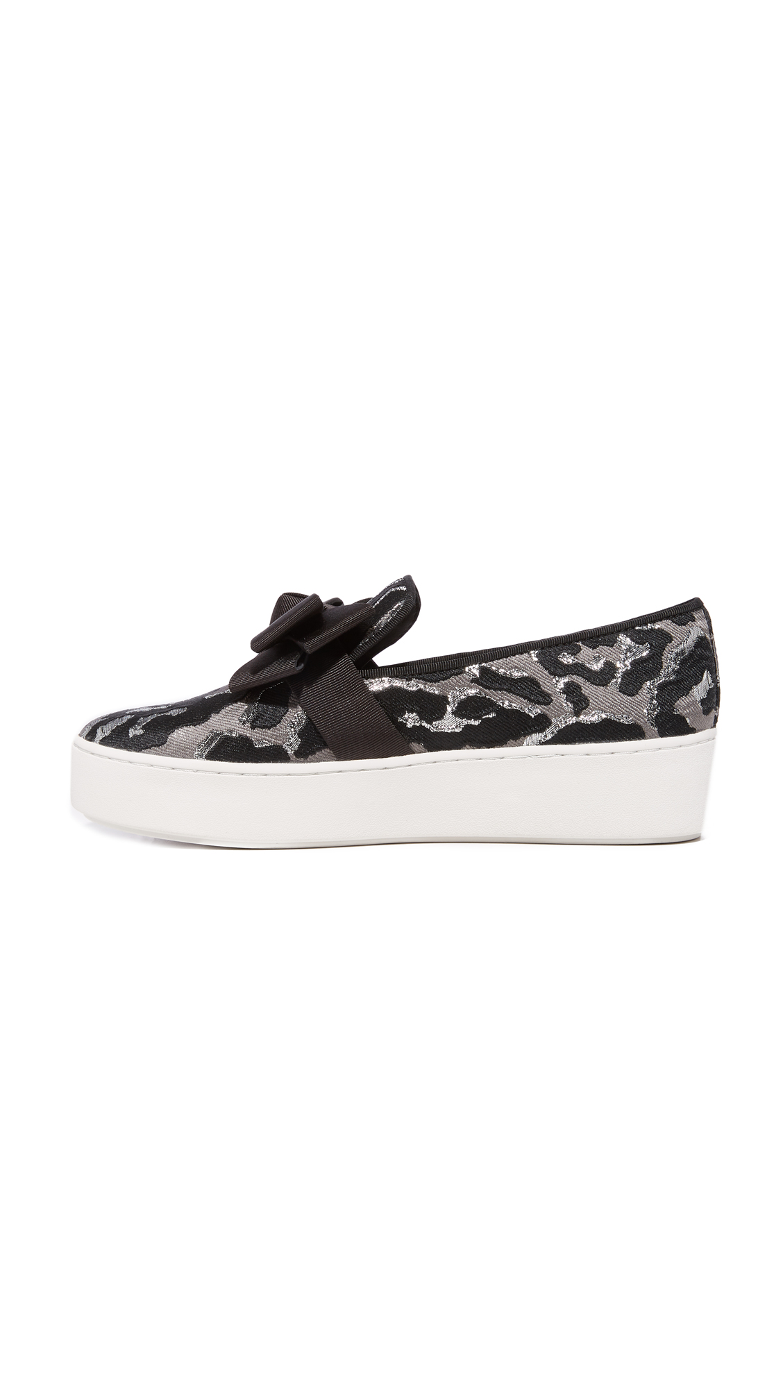 Casual Michael Kors Collection slip-on sneakers are updated with a metallic, camo print. A grosgrain bow accents the vamp. Rubber platfom and sole.Fabric: Jacquard.Imported, China.MeasurementsPlatform: 1.5in / 39mm