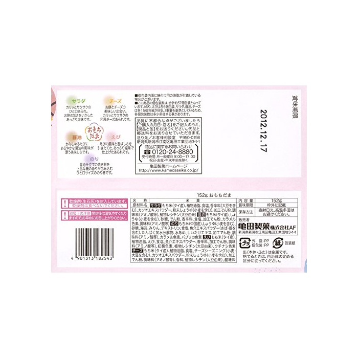 원재료:【샐러드】찹쌀(타이산)고, 식물성 기름지,식염,향신료(대두를 포함한다)고, 가다랭이 엑기스 파우더,분말 간장(밀을 포함한다)고, 가공 나오지 않겠 분,조미료(아미노산등)고, 식물 레시틴(대두 유래)【간장】찹쌀(타이산)고, 간장(밀을 포함한다)고, 설탕,나오지 않겠 분,향신료,식염,가공 나오지 않겠 분,카라멜 색소,조미료(아미노산등)【(풀/모범/직경)해초】찹쌀(중국산)고, 간장(밀을 포함한다)고, 설탕,김,미림,덱스트린,식염,생선 및 조개류 엑기스 파우더(하면 닭을 포함한다)고, 담백 가수분해물,물엿,하여 있어 뛰어나 엑기스,가공 나오지 않겠 분,조미료(아미노산등)고, 카라멜 색소,파프리카 색소【새우】찹쌀(타이산)고, 식물성 기름지,새우,식염,생선 및 조개류 엑기스 파우더,향신료,가공 나오지 않겠 분,조미료(아미노산등)고, 홍국색소,식물 레시틴(대두 유래)고, 치자나무 색소【치즈】찹쌀(타이산)고, 식물성 기름지,식염,치즈 seasoning(밀 대두를 포함한다)고, 가다랭이 엑기스 파우더,분말 간장(밀을 포함한다)고, 가공 나오지 않겠 분,조미료(아미노산등)고, 향료,식물 레시틴(대두 유래)고, 신맛료
