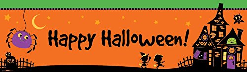 -. Feature : Includes (1) vinyl party banner. Measures 18" x 61" in size. / Add matching tableware, favors, accessories, or a party kit bundle to complete your party! / Features a fun Haunted House design with trick or treaters!