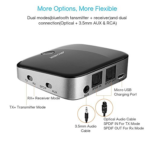 The best choice for bluetooth transmitter/receiver for TV, Home / Car Stereo System Dual Connection You can channel more wireless music than ever before with a 3.5mm audio cable or TOSLINK optical SPDIF audio cable.