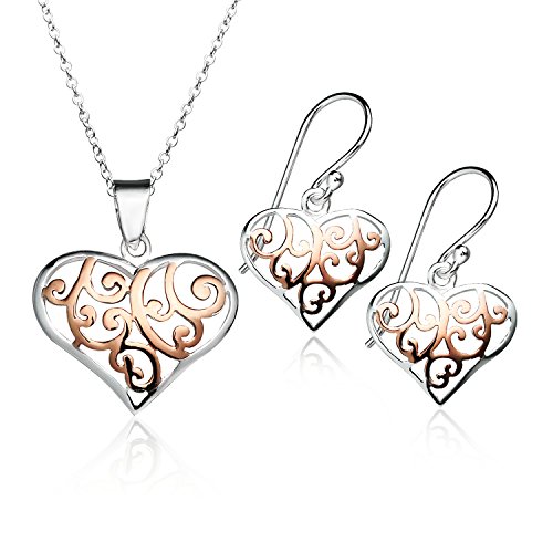The filigree pendant also comes with a free 18 inch chain necklace. This set is available in the Colors of Silver, Yellow Gold Flash Sterling Silver and Rose Gold Sterling Silver. FEATURES: