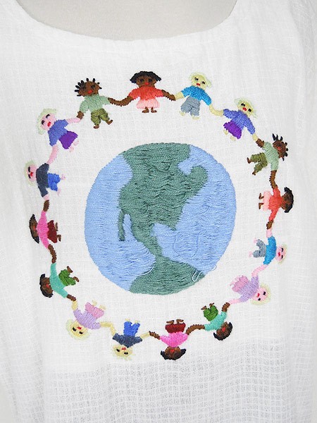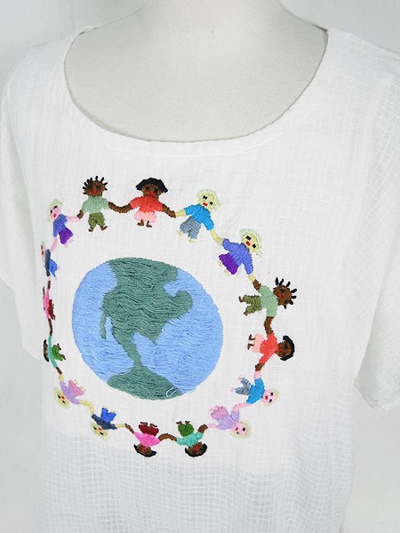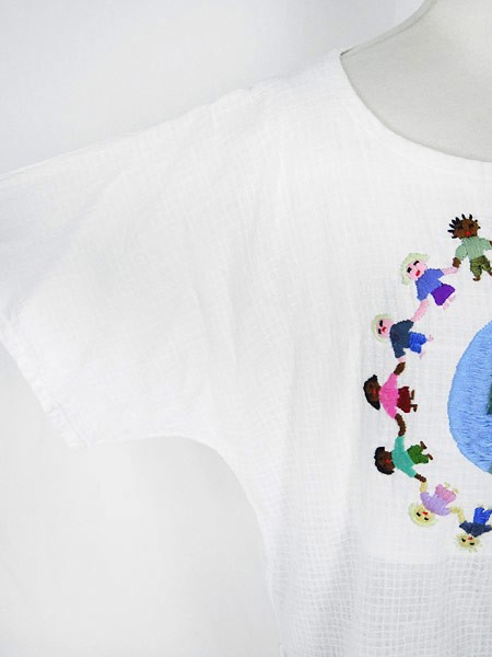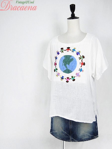 Ladies ブランド- カラー白ベース・カラフル メール便不可 コンディション★★★ 素材- 表記サイズL スタッフコメント素材表記なし、コットンリネンのような質感です。地球刺しゅうに糸出あり。 実寸サイズ 着丈 66 cm 身幅 56 cm 袖丈 29 cm (ラグラン袖の為、襟元から袖先までの計測) ※ウエスト・ヒップ以外は平置き採寸