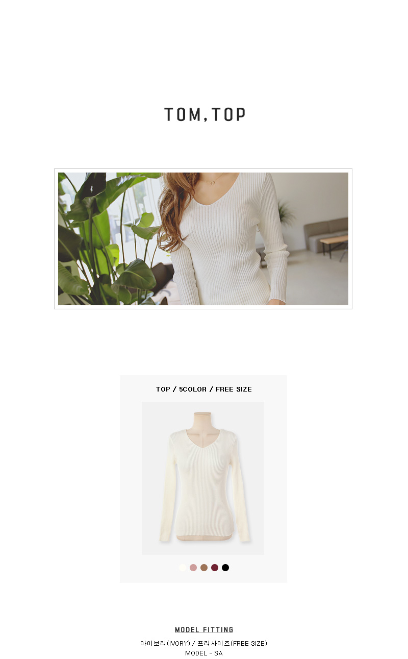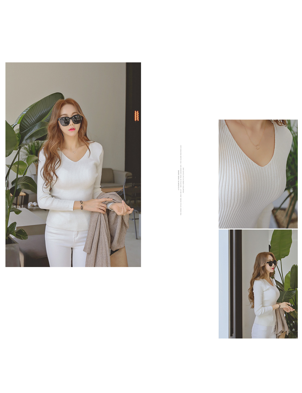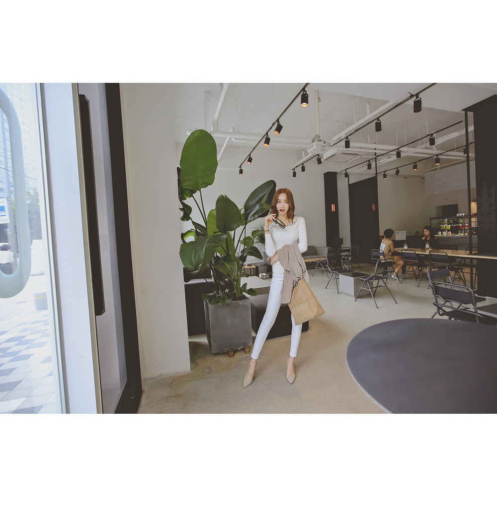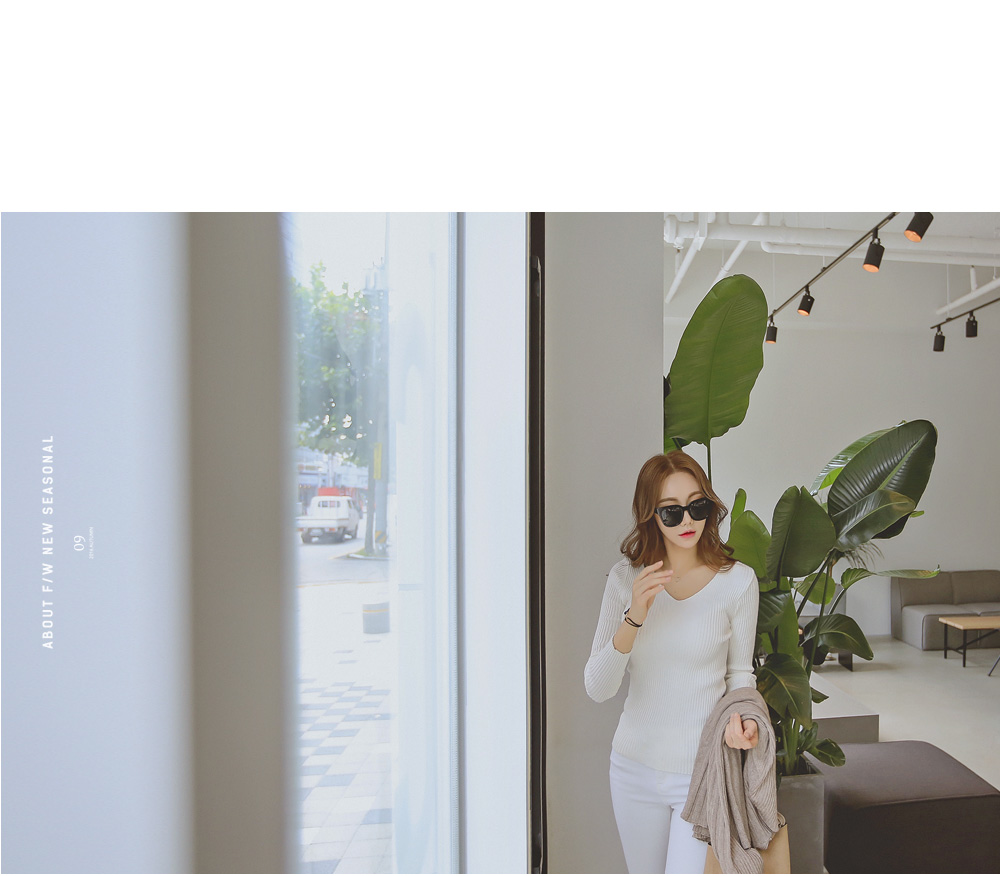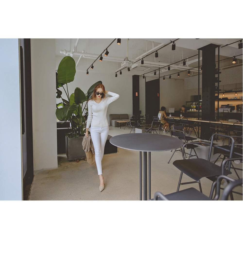 너무 깊지 않은 브이넥으로 쇄골라인이 살짝 보여