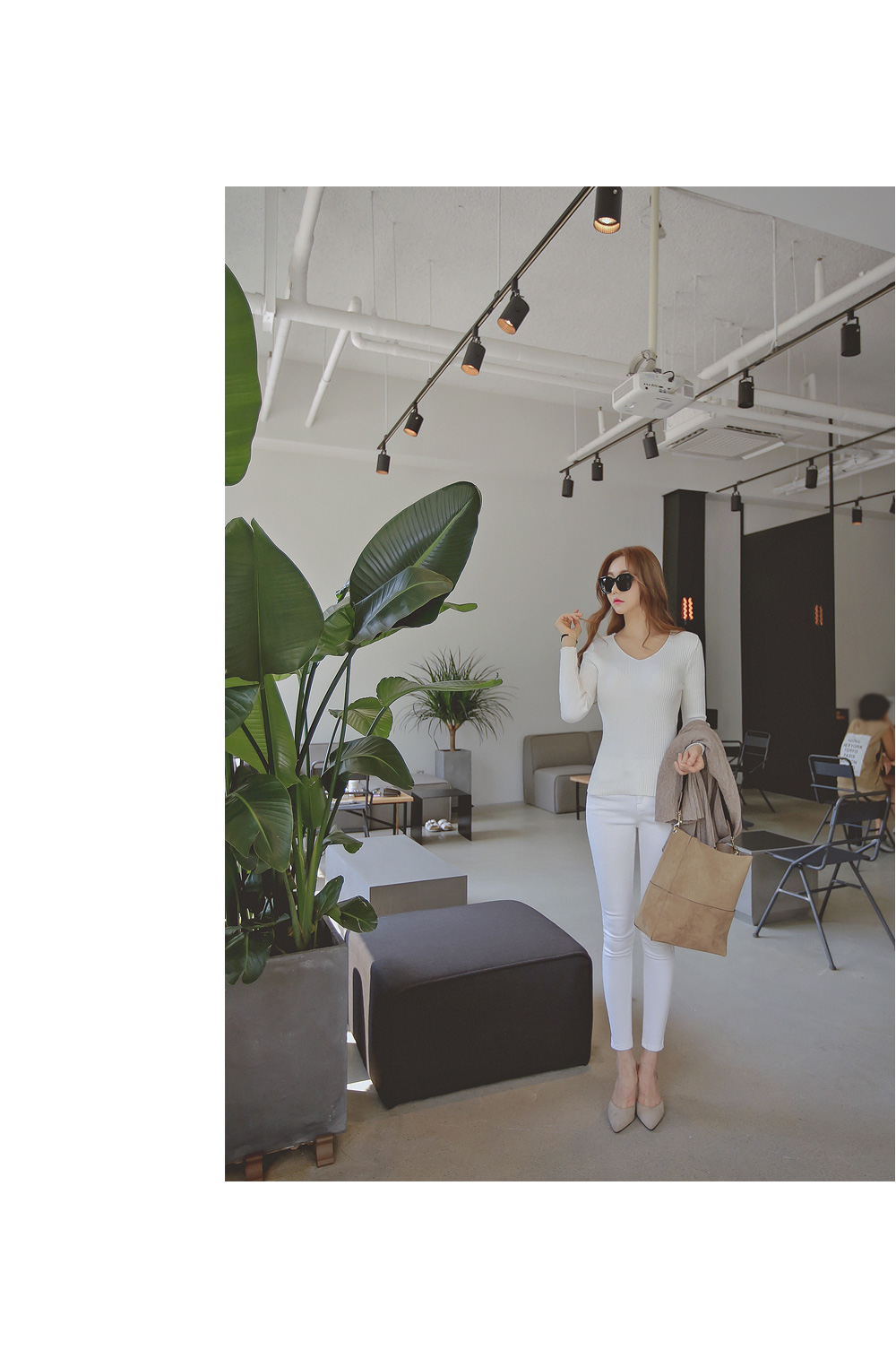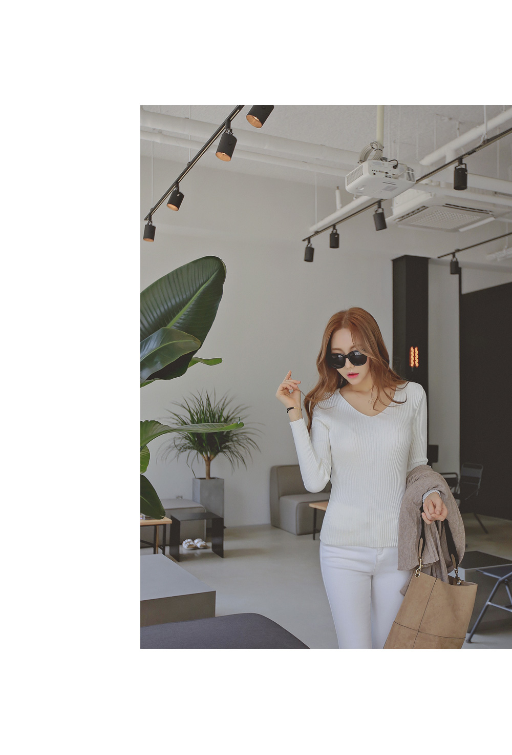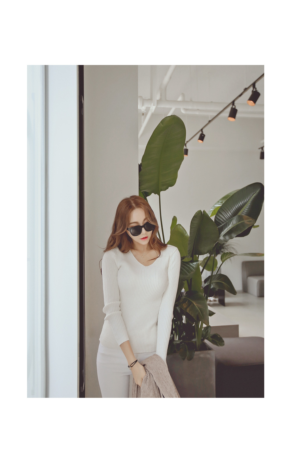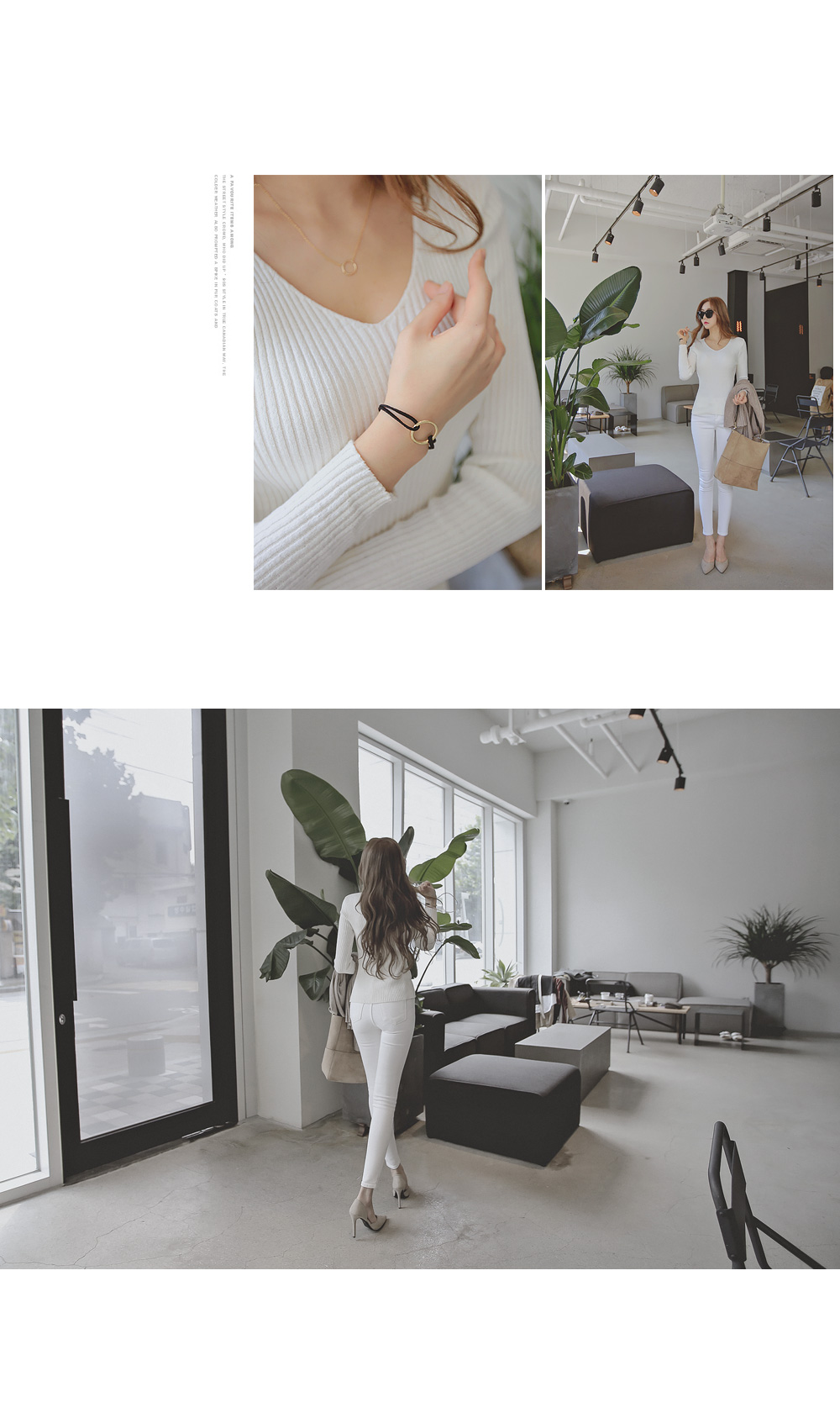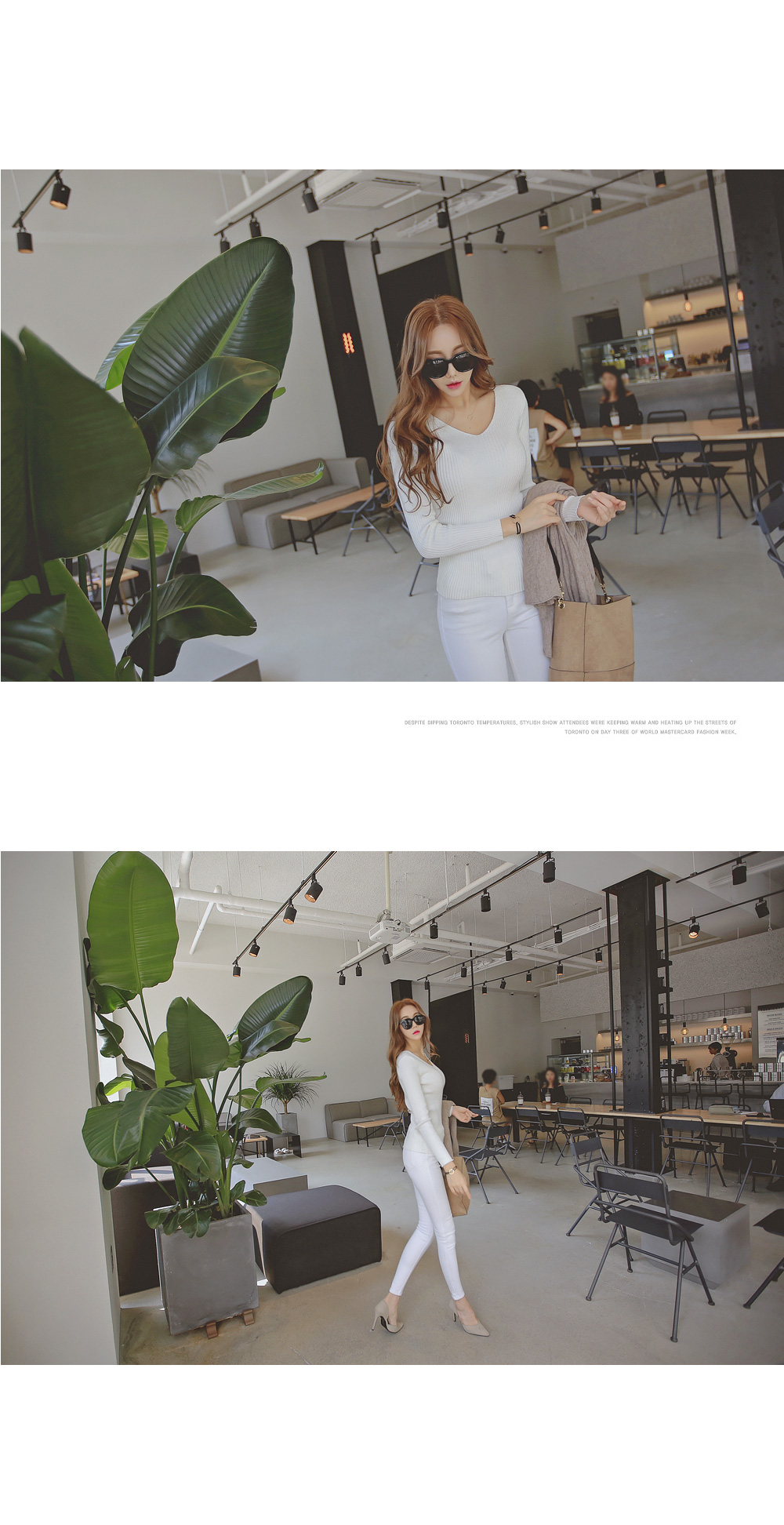 너무 깊지 않은 브이넥으로 쇄골라인이 살짝 보여