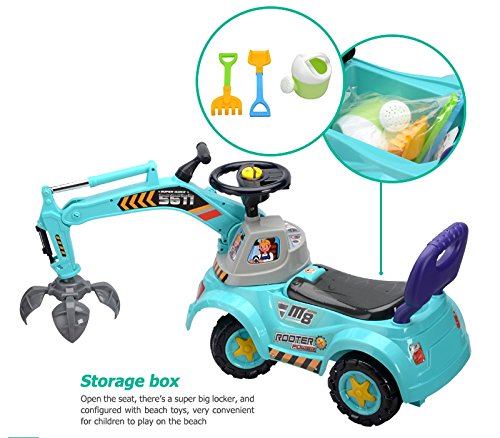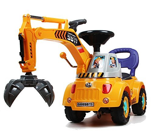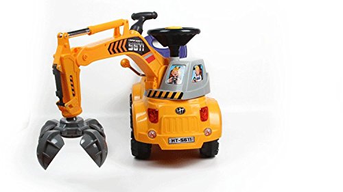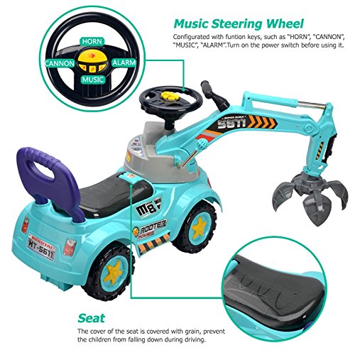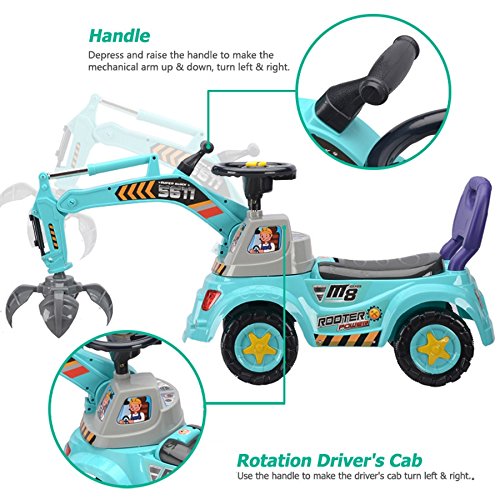 -. Feature : 3-in-1 Ride-On Toy: Grabber, Scooter & Pulling cart / Rotation driver's cab, Raise or depress the handle to make the arm up or down / Music steering wheel with switch, Lights flash with music / Help to build baby's physical skills and learn movement / Around 20 minutes to assemble, Color may vary