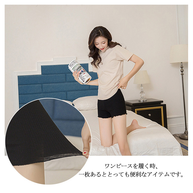 | シンプル3分丈インナーパンツの登場です!透け感あるパンツやひらひらしたワンピース、ミニスカートには欠かせないアイテム。ウエストがゴムで柔らかくて伸縮性のあるカット生地だからストレスゼロ☆お持ちのボトムに合わせやすいカラーばかりだからお好きなカラーをチョイスして見て♪ ワンピースを履く時、一枚あるととっても便利なアイテムです。 | |