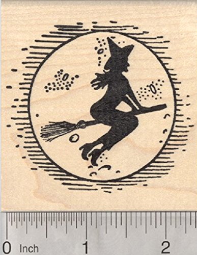 -. Title : Halloween Witch on Broomstick Rubber Stamp, with Moon