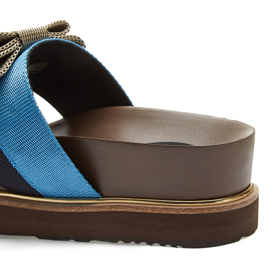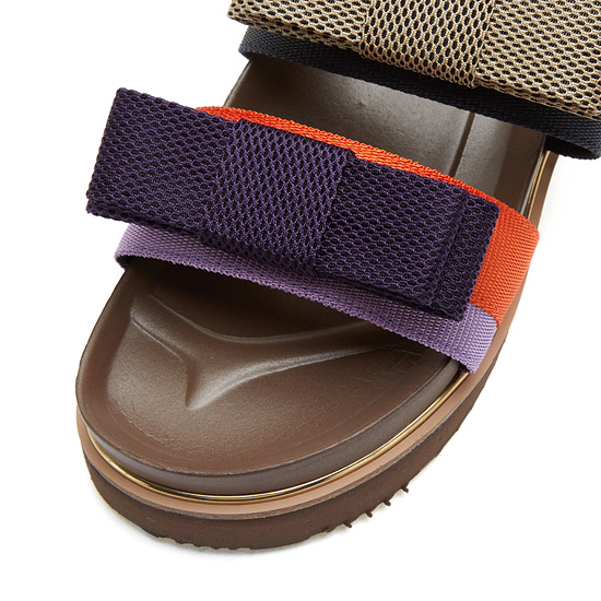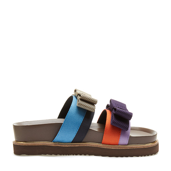 - 컬러풀한 리본 배색이 돋보이는 발랄한 무드의 샌들.