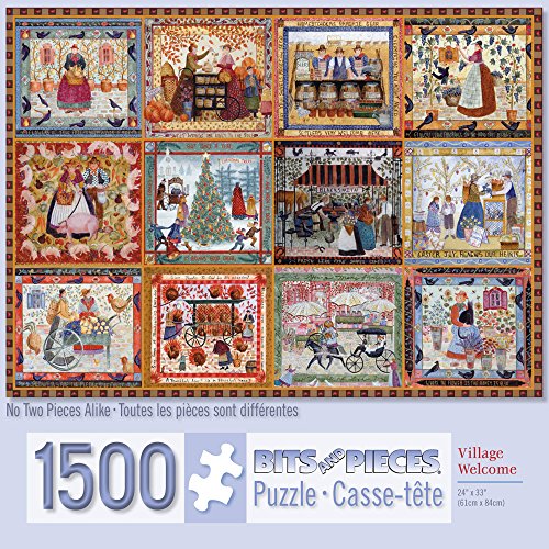 -. Binding : Toy -. Brand : Bits and Pieces -. EAN : 0782495944914 -. Feature : Contains a 1500 Piece Jigsaw Puzzle designed by artist Carol Endres. / Made with recycled cardboard. / Die-cut puzzle pieces are easy to handle - and no two are alike. Our 1500 Piece Puzzles are fun and challenging. / Twelve early American style quilt squares are brought together to form one amazing country quilt jigsaw puzzle. / Puzzle Size is 24" x 33" when completed. -. IsAdultProduct : 0 -. Label : Melville Direct -. Manufacturer : Melville Direct -. MPN : 42114 -. PackageQuantity : 1 -. PartNumber : 42114 -. ProductGroup : Toy -. ProductTypeName : TOYS_AND_GAMES -. Publisher : Melville Direct -. Studio : Melville Direct -. Title : Bits and Pieces-Village Welcome - 1500 Piece Jigsaw Puzzle -. UPC : 782495944914