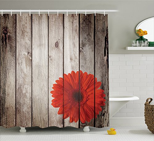 Ambesonne Grunge Decor Shower Curtain Set, Rustic Wooden Garden Fence with a Red Daisy Bloom Picture Flower Art Floral Garden Design, Bathroom Accessories Collection, Polyester Fabric,Grey Red