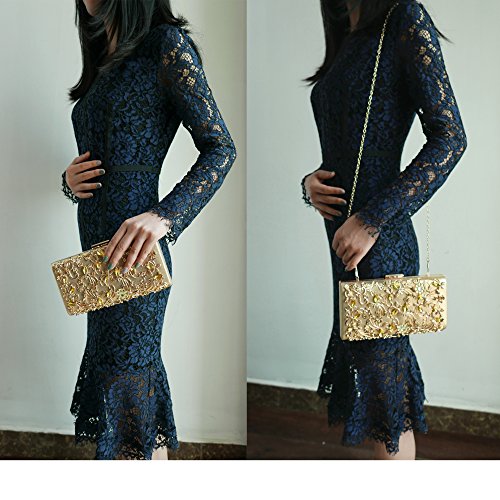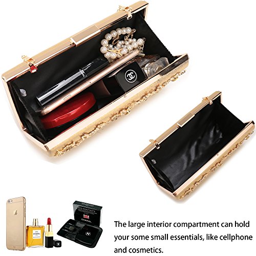 The glamorous evening party clutch features allover sparkling crystals on the front of this chic shaped clutch and has metal frame construction with clasp on the top. It features magnetic hasp closure and detachable chain which offers versatile carrying options as handbag, clutch, a shoulder bag or a cross-body bag. The crystal handbag is so royal, noble and brilliant that it will be a perfect status symbol and a bold gift for femininity.