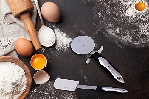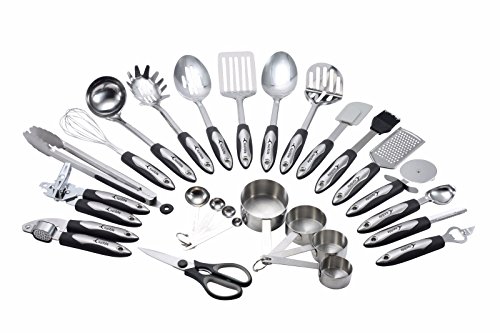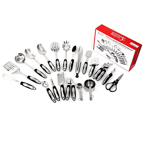 -. Feature : 26-Pieces Stainless Steel Utensils Set Includes (Utensilios de Cocinas): Slotted Turner / Spatula / Flipper, Potato masher, Solid spoon, Slotted Spoon, Ladle, Spagetti Server, Baking Spatula, Bottle opener, Grater, Potato peeler, Garlic press, Whisk, Basting Brush, Ice cream scoop, Tong, Scissor, Pizza cutter, Can Opener, Measuring cups (1 Cup, ½ Cup, 1/3 Cup, ¼ Cup, Tablespoon, Teaspoon, ½ Teaspoon, ¼ Teaspoon) / HIGH QUALITY SET: - Each gadget in the kitchen accessories set is made of fouling resistance, high quality, sturdy, high grade stainless steel with non-toxic, high quality rubber handle. FDA Approved, Eco-friendly. HEAT RESISTANT: - Up to 572 ºF (300 °C). Measuring cups and spoons in 100% stainless steel so that they don't break like plastic measuring cups often does. / EASY TO USE: - Ergonomically designed handles and perfectly shaped heads. Hanging loops on each utensil shaft for easy storage. Perfect Kitchen Starter Set for Cooks of all Skill Levels! SAFE TO USE: Perfect for high temperatures where nylon would melt. / DISHWASHER SAFE - The kitchen tools can be cleaned in a dishwasher or by hand for better hygiene and health. / MONEY BACK GUARANTEE: We believe that you will love our Cookware Utensils Set as much as we do, but in case you don't we offer you 30 day, no questions asked, money back guarantee. Click the "Add to Cart" button to get your Utensils Set now!
