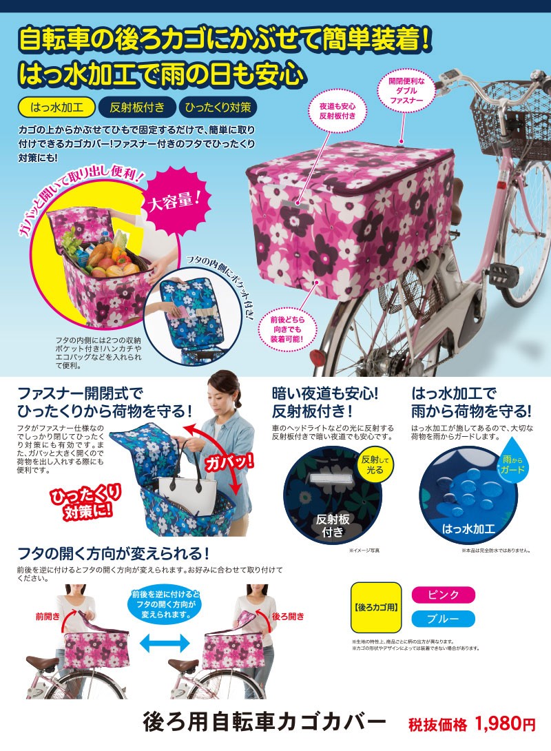 | 商品説明 | 自転車のかごにかぶせるだけ!はっ水加工で雨の日も大丈夫! ・はっ水加工を施した、自転車かごカバー!雨の日のお買い物も◎ ・かごにかぶせるだけで、ひったくりなどによる防犯対策にも!反射板付きで夜道も安全♪ ・1周ファスナーで、ガバッと開けてたっぷり収納! |