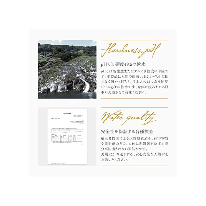 안심 안전한 수질 제삼자 기관에 의한 수질검사필입니다.유해 물질이나 방사능 등의 인체에 악영향을 미치게 하는 성분이 검출되지 않는다,안전한 수입니다.미양당이 보낸다,안심인 천연 수를 즐겨주십시오.